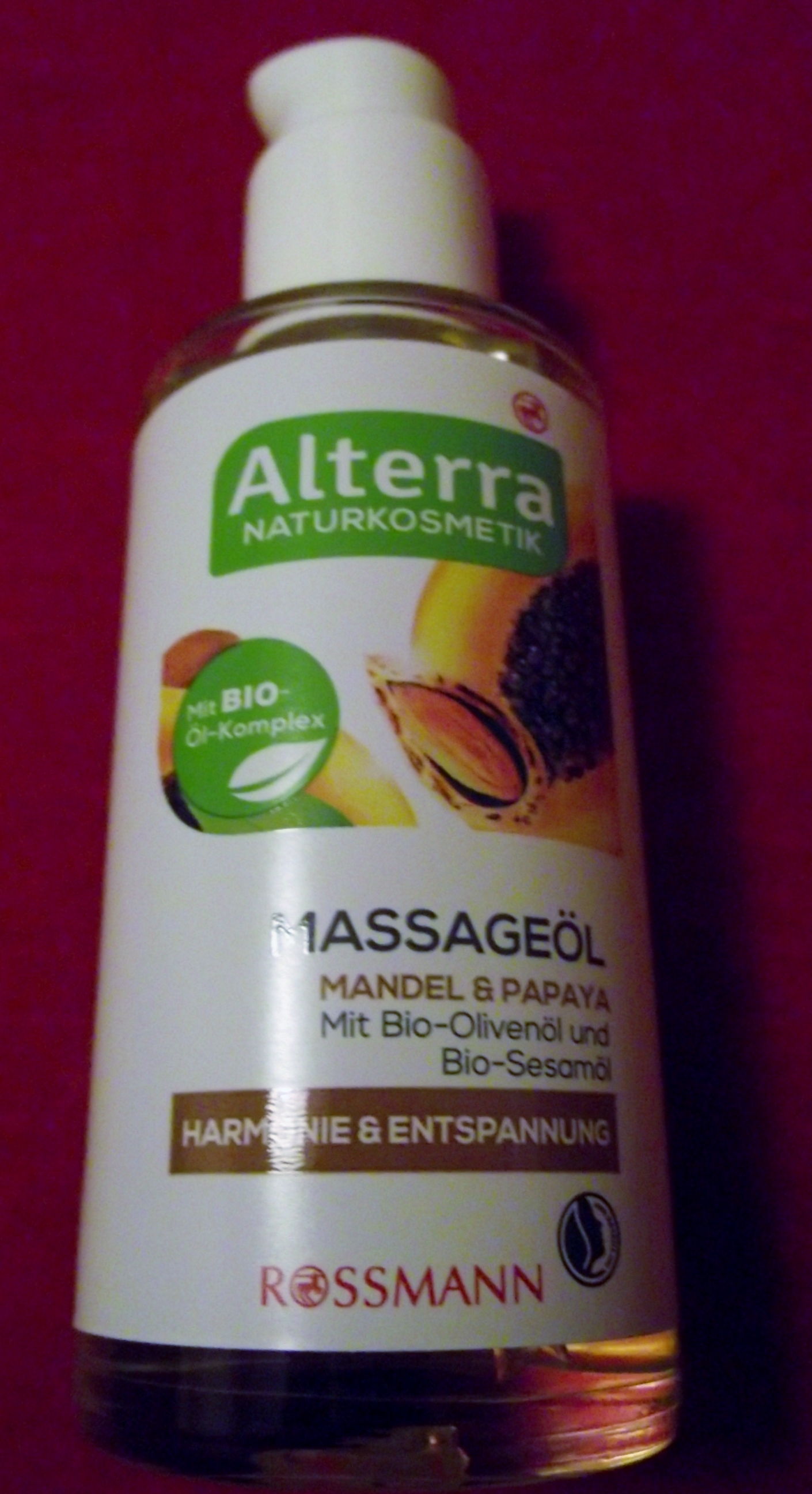 Das Massageöl von Alterra Naturkosmetik soll für Harmonie und Entspannung sorgen. Es enthält 100ml, ist vegan und mit Mandel und Papaya.