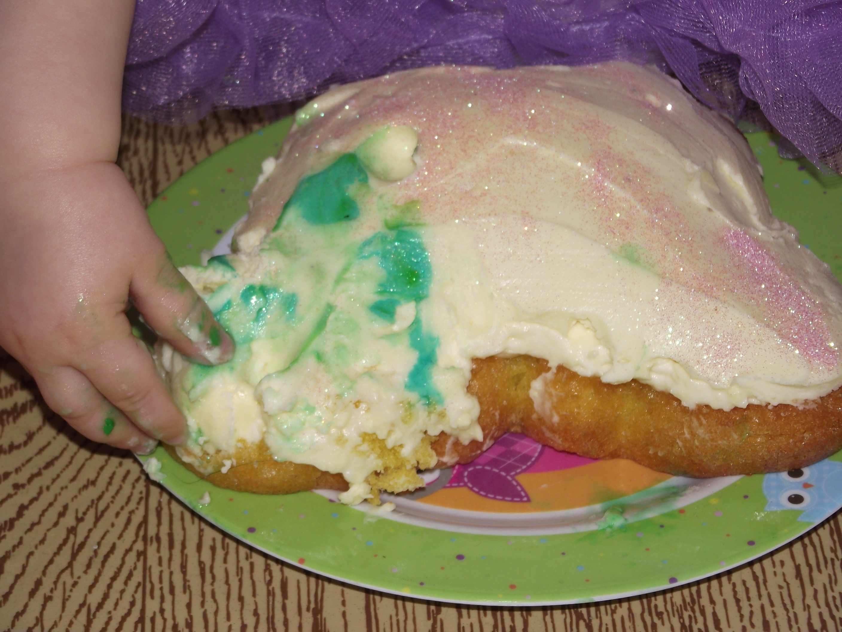 Cake Smash kommt aus den USA und bedeutet kurz gesagt, dem Kind eine Torte zu geben, mit der es anstellen kann, was es will. Nett aussehen darf es dabei aus. Und die Eltern oder jemand Professionelles fotografiert. Das Bärchen trug lila Tüll und Feenflügel. Ich habe etwa 60 Fotos gemacht.