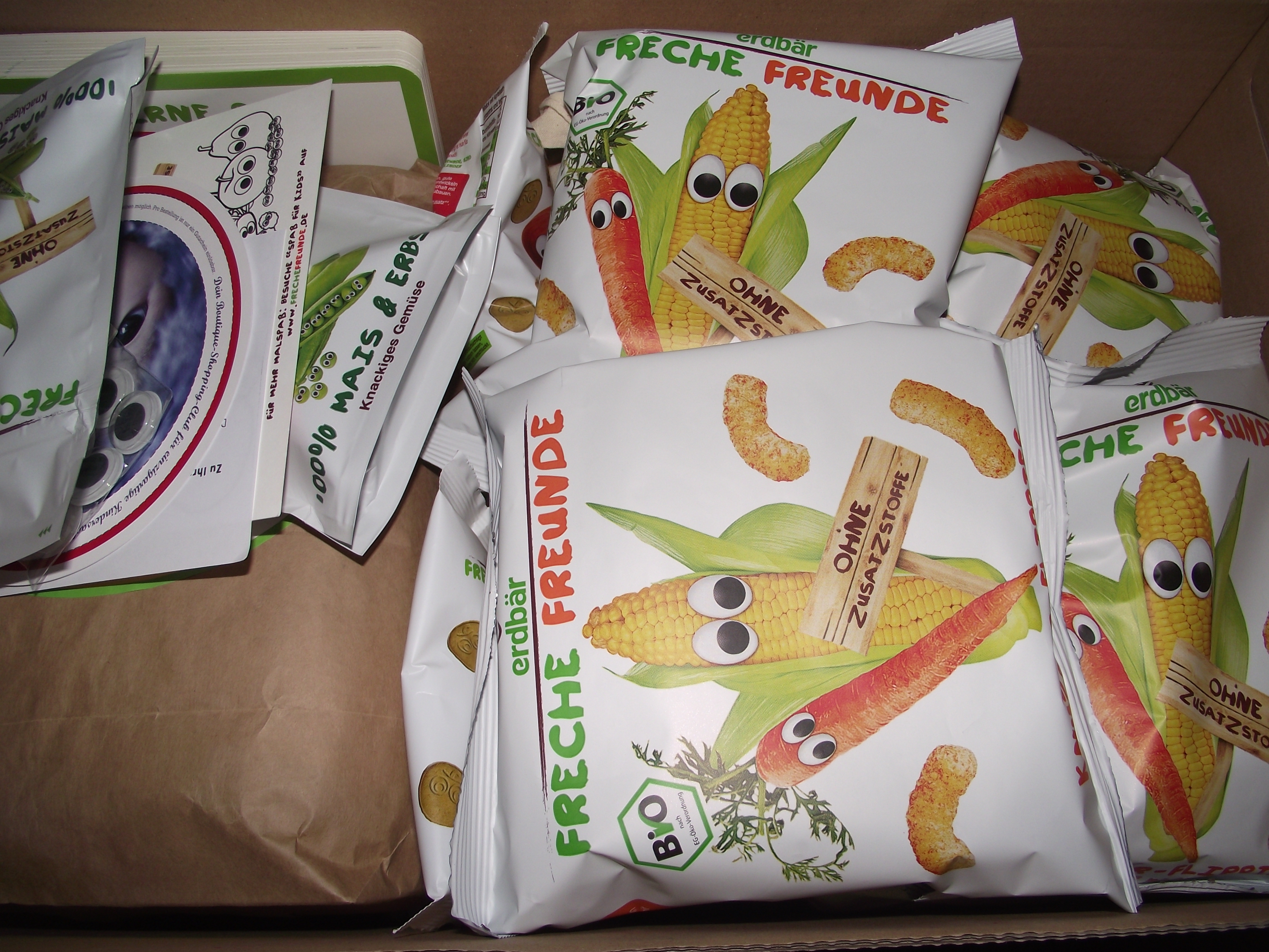 Vor kurzem gab es eine Aktion, die ich über Facebook mitbekommen habe und es gab (einen Tag glaube ich) 50% Rabatt im Onlineshop auf alle Snacks. Ich musste zugreifen! Ab und an kaufen wir Produkte von den Frechen Freunden. Bei ihnen geht es darum, leckere Snacks aus Obst und Gemüse für Kinder zu schaffen, die schon von der Verpackung her attraktiv sind und Lust auf gesunde Ernährung machen.Und die einzelnen Sorten haben auch Namen ( wie Alfred Apfel) und erleben auch auf der Internetseite lustige Abenteuer und werden so richtig interessant und fassbar für Kinder. Kurz zusammengefasst. 🙂 Aber auf jeden Fall lecker. So sah das Paket nach dem Öffnen aus:
