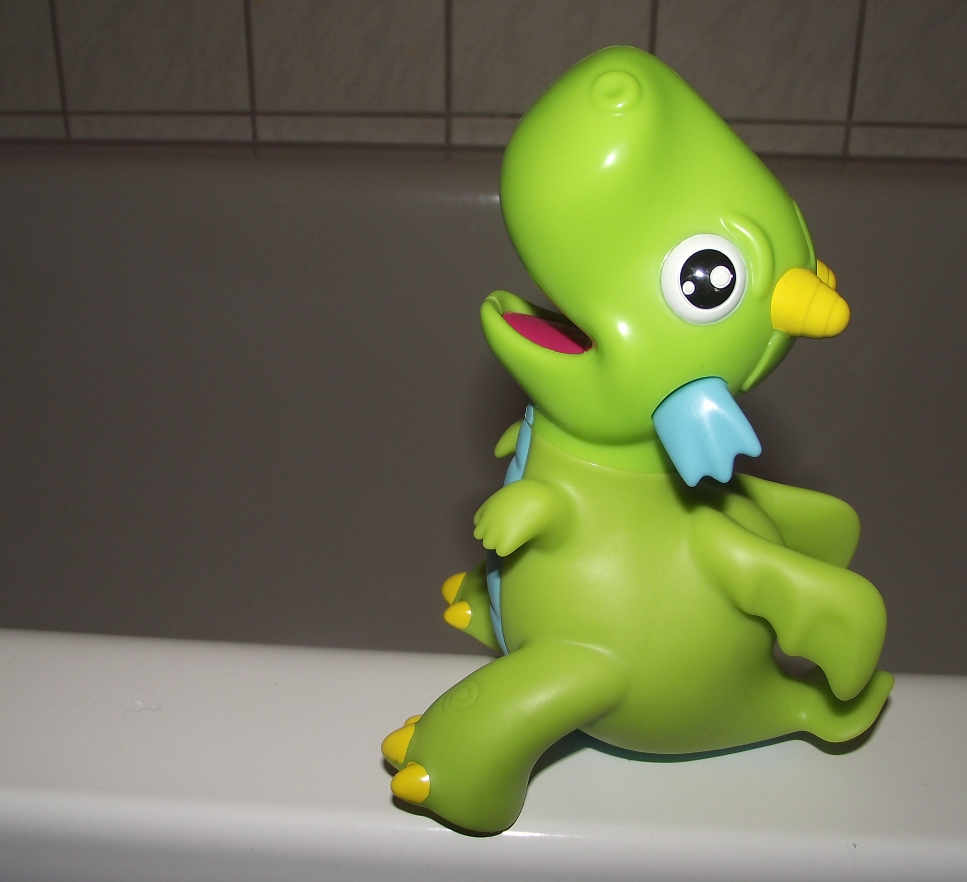 Prinzipiell ist der Leuchtende Badespaßdrache ab 18 Monaten geeignet, das Bärchen findet ihn aber mit ihren 16 Monaten schon ganz toll und deswegen darf (eher muss, es wird mit lautem DRACHE eingefordert) er nicht nur immer mit in die Badewanne, sondern wird auch mal aus dem Badezimmer entführt, um im Wohnzimmer die Katze zu erschrecken oder im KInderzimmer vorbei zu schauen, dessen eine Wand genauso herrlich knallgrün leuchtet, wie er. Im Garten zum Planschen im Babybecken war er auch schon, inklusive anschließender Sandpanade. Aber kein Problem, Wasserspielzeug ist ja bekanntlich leicht zu reinigen.