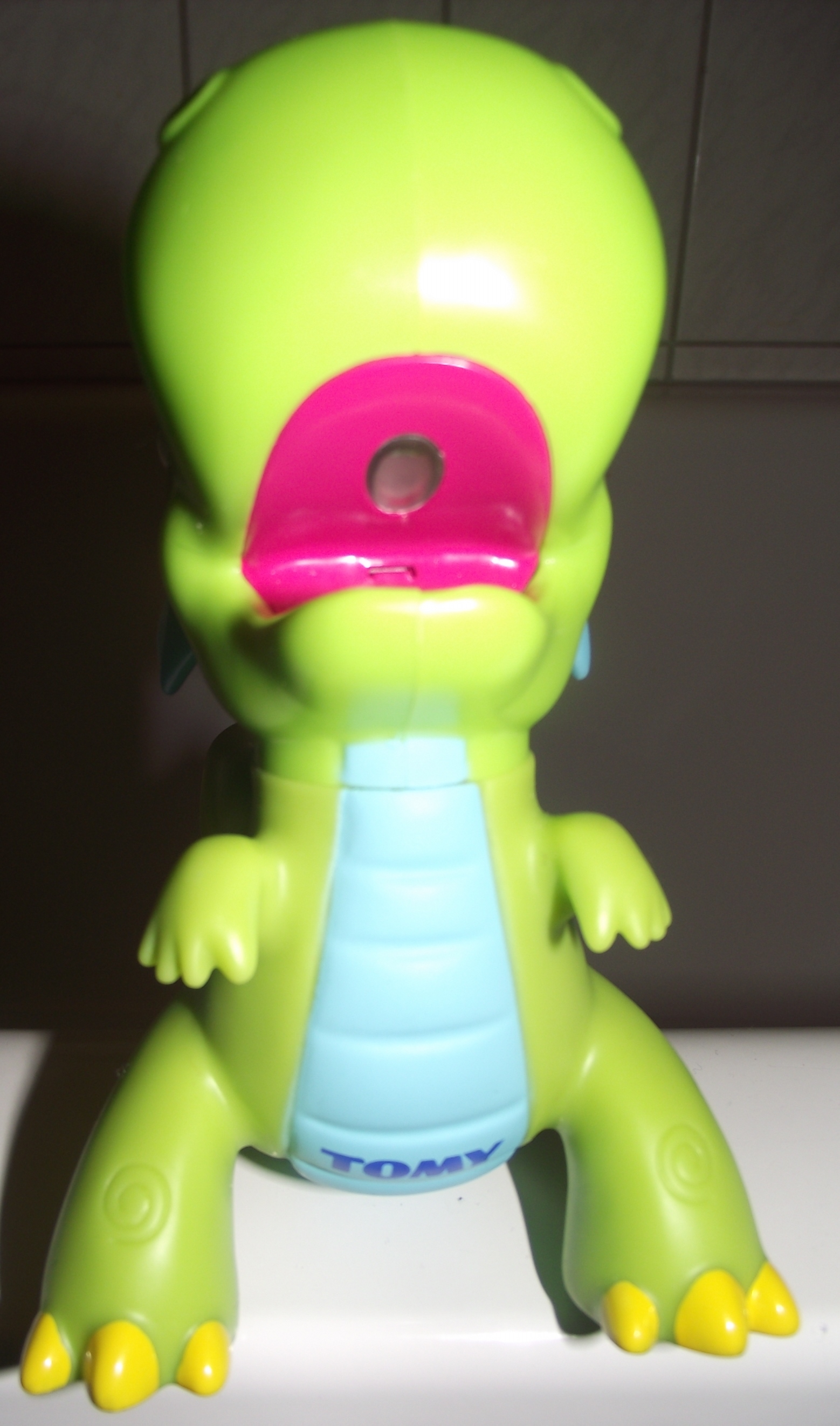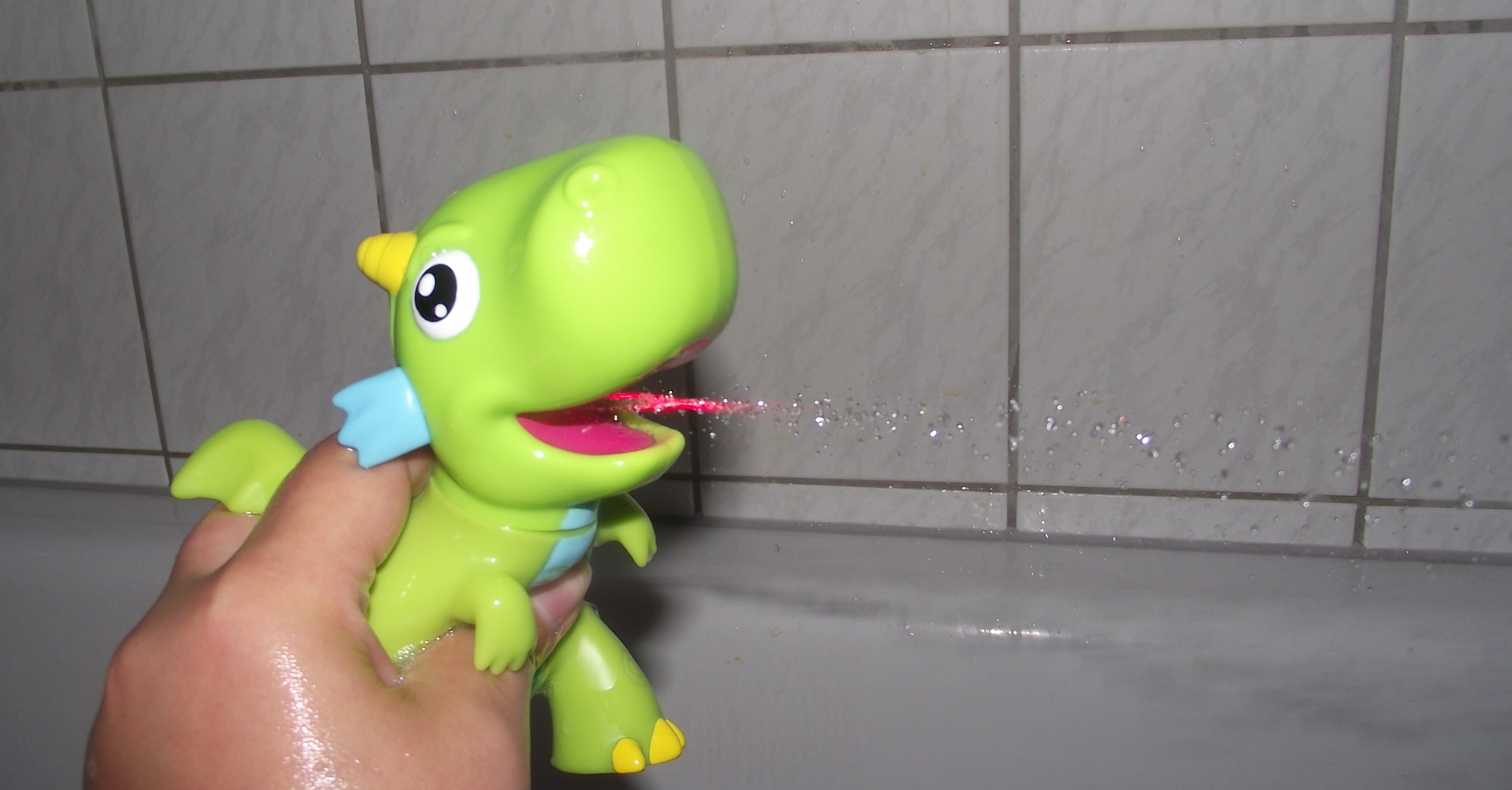 Im Profil sieht er schon sehr frech aus, nicht wahr? Der Leuchtende Badespaßdrache soll aber nicht nur schick aussehen, sondern kann Feuer spucken. Ein Wasserspielzeug, das Feuer spuckt? Kein Problem für TOMY.