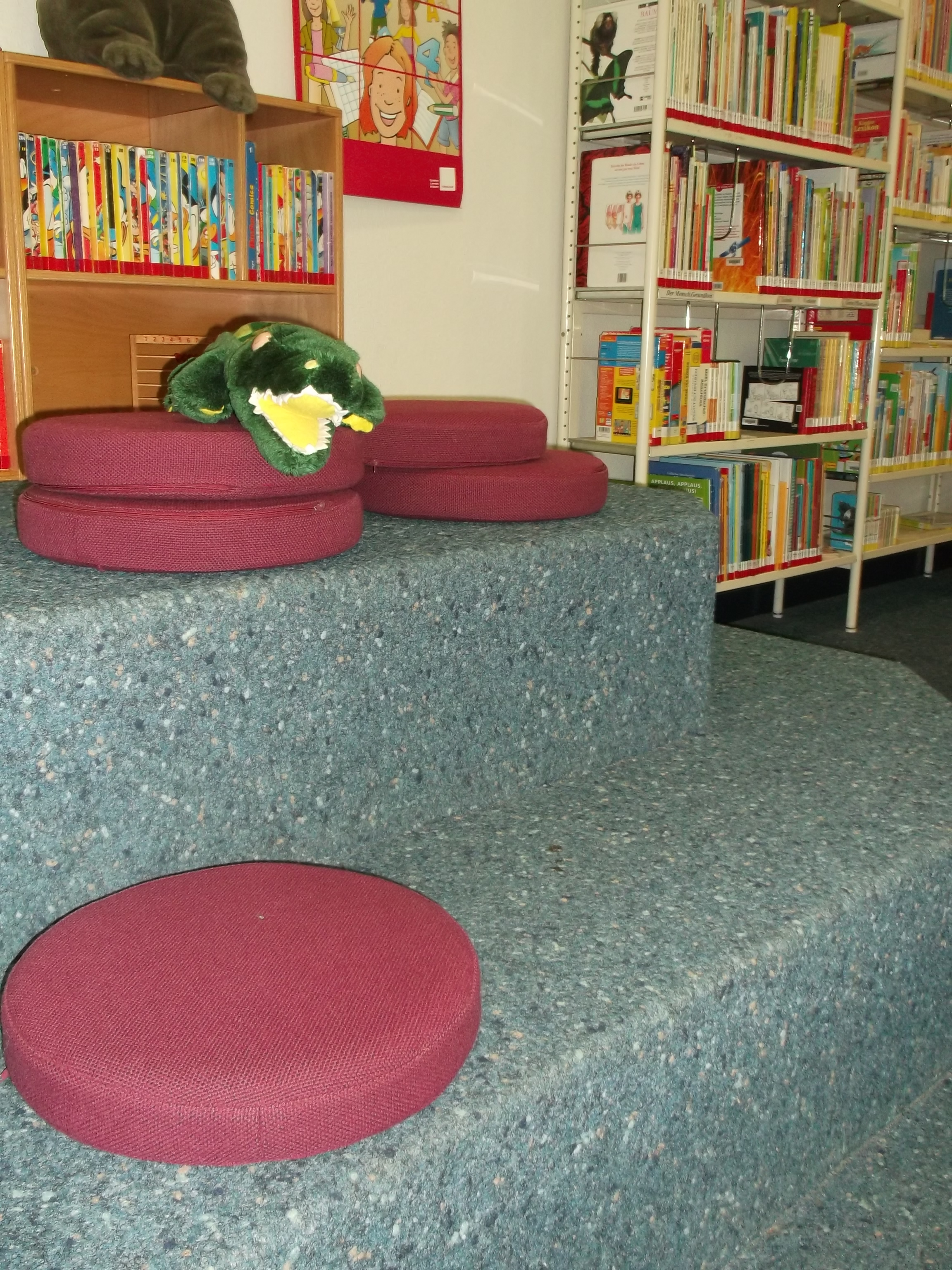 Und diese Treppe gab es auch im Kinderbereich und das Bärchen war etwa 30 Minuten nur damit beschäftigt hoch und runter zu krabbeln und die Sitzkissen im ganzen Raum zu verteilen, aber so hatte ich die Möglichkeit mich mal in Ruhe umzusehen und mir Bücher rauszusuchen, die ich gerne für das Bärchen ausleihen wollte. Auch die Auswahl an Spielen, Hörspielen, DVDs und Büchern ist dort sehr gut, nur die Kleinkindabteilung könnte etwas fülliger sein. Aber der ganze Bereich ist einfach schön und abwechslungsreich gestaltet und hat dem Bärchen sehr gut gefallen. Ich konnte sie dort gar nicht weg bekommen, obwohl schon Mittagszeit war!