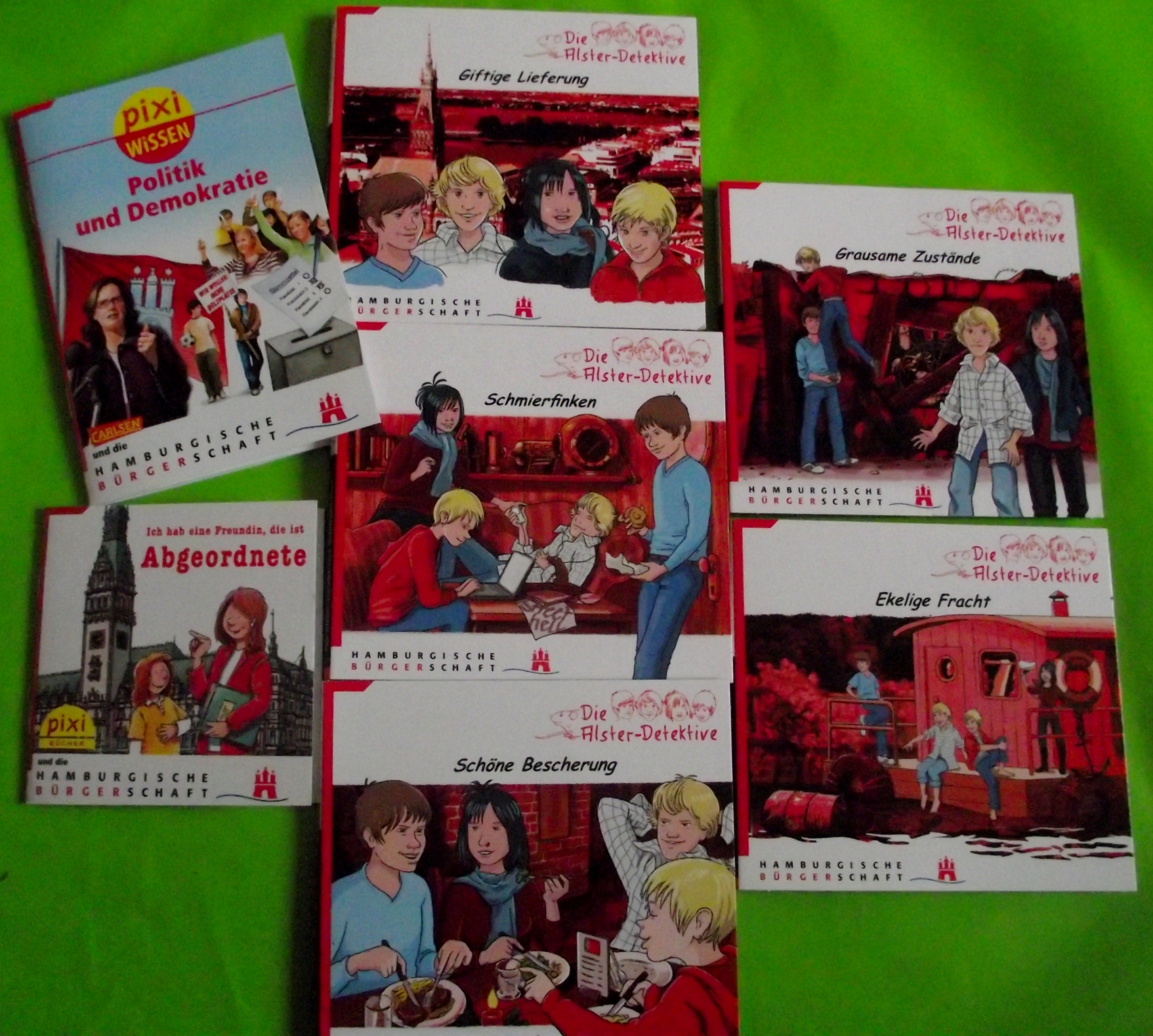 Bei der Hamburger Bügerschaft kann man sich diese tollen CDs von den Alster-Detektiven, das süße Pixi Buch „Ich hab eine Freundin die ist Abgeordnete“ und das Pixi Wissen Politik und Demokratie bestellen. Das Pixi Buch wurde erstmal durchgelesen und die CDs werden gerade von mir gehört, bis das Bärchen etwas älter ist.