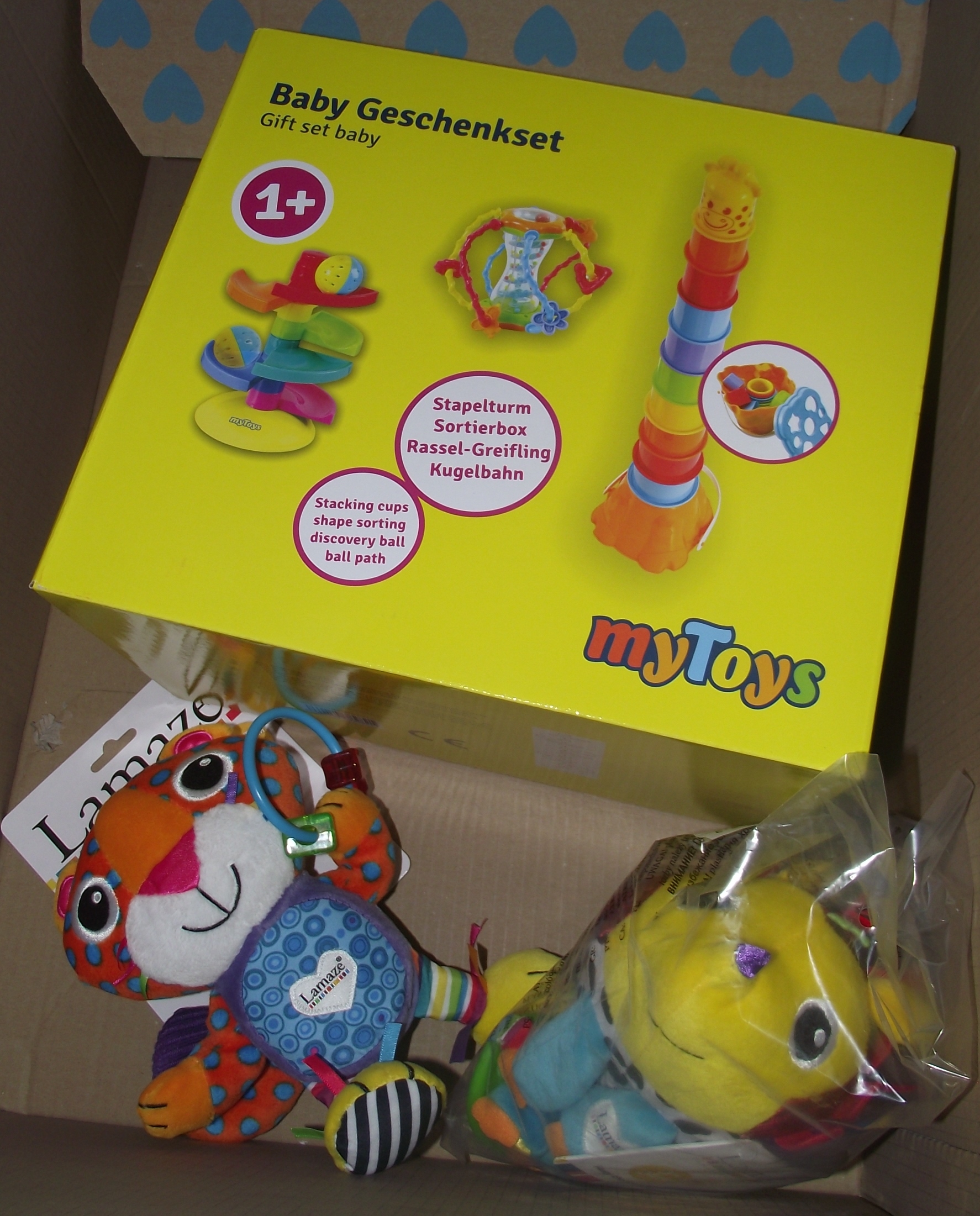 Das ist meine mytoys Bestellung. Es gab ja jetzt die Aktion, dass man das Softbuch gratis dazu bekommt, wenn man Lamaze Produkte im Wert von mindestens 20 Euro bestellt. Hab ich gemacht und zwar Lionel, passend zum Buch und den süßen Igel, der wird ein Geschenk. Das Softbuch ist leider nicht mitgekommen, aber ich habe mytoys angeschrieben, es gab wohl einen Computerfehler und nächste Woche kommt es her. Auch als Geschenk gedacht. Das Baby Geschenkset fand ich super. Das sind dann nämlich schon drei Weihnachtsgeschenkzugaben, für die KInder unserer Freunde gibt es ja immer ein kleines Geschenketütchen und da passen ein Stapelturm, eine Sortierbox, ein Rassel-Greifling und eine Kugelbahn natürlich super rein. Ja, ich fange jetzt schon mit den Weihnachtsgeschenken an, ich hasse es, wenn ich auf den letzten Drücker erst noch was besorgen muss!