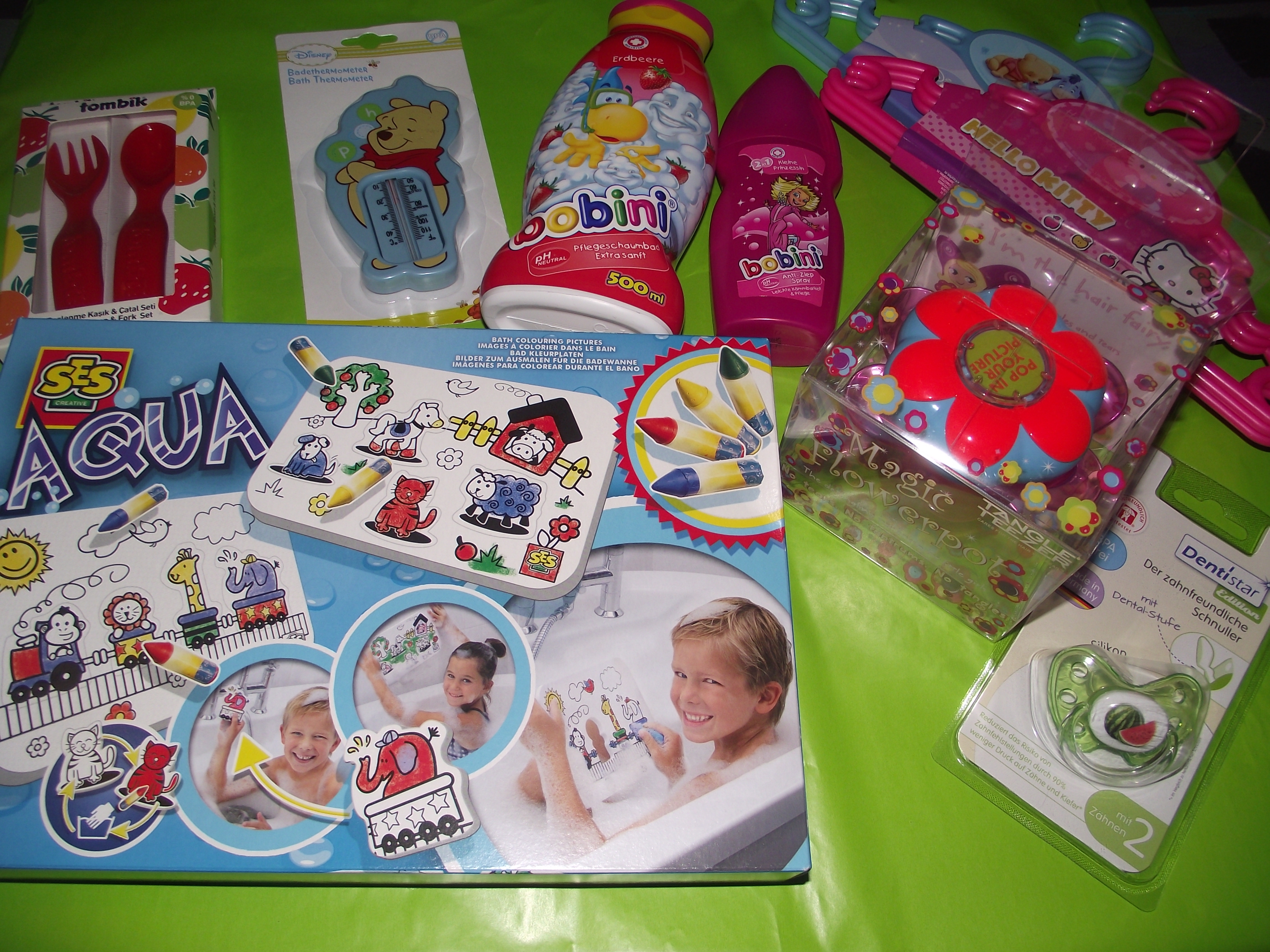 HIer seht ihr, was wir auf der BABYWELT gekauft haben, besonders gefällt mir das AQUA Set von SES creative, es sind zwei Puzzles für die Badewanne, die auch in eben dieser bemalt werden können, das ist doch mal eine tolle Idee! Bobini musste natürlich zum Messepreis sein, das Besteck ist einfach farblich schön und die Kleiderbügel unschlagbar günstig.