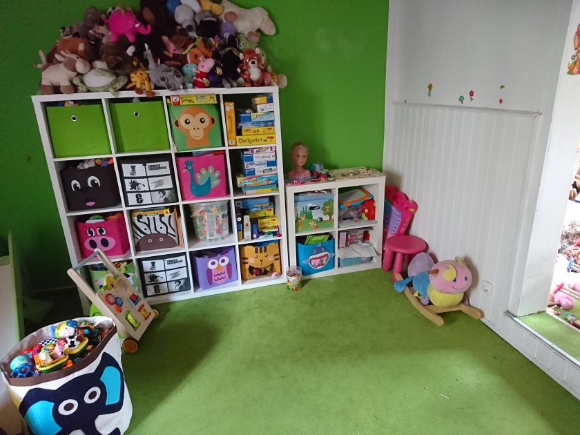 Dieser eine Raum ist mir wichtig. Hier gibt es ein Ordnungssystem, hier weiß ich wo was hin gehört, hier wird umgestellt, umgeräumt und optimiert. Ich mache mir Gedanken und bin eigentlich auch die Einzige, die weiß wo genau was hin kommt. Für mich ist dort alles logisch, für meine Tochter auch, für alle anderen eher nicht. Und genau an diesem Ort, tut uns die Ordnung gut. Wir wissen, wo was ist. Wo was hingehört. Und auch, was da ist. Wenn wir spielen, dann ist relativ schnell aufgeräumt, unser System erleichtert das. Das System besteht aus Kisten und Boxen. Eine Kiste mit Bausteinen, eine mit Autos, eine mit Tieren, eine mit Musikinstrumenten, eine mit Holzspielsachen und so weiter. Ein Sitzhocker, in dem Kleinkram ist. Dazu die große Spielküche und das Bücherregal. Für uns alles leicht nachvollziehbar.