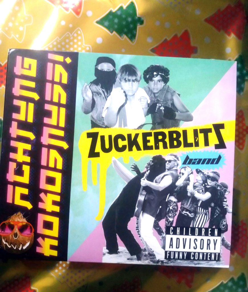 Wenn ein erfolgreicher Rapper und Songtexter (Malo=Mario Wesser) und der Bassist ( auch von Deichkind bekannt) Porkey (Sebastian Dürre) sich nach 20 Jahren mit ihren Familien in Hawai treffen und gemeinsam eine Kinderlieder CD mit anderen produzieren, kann man schon ahnen, dass das gut wird. Ganz besonders, wenn sie sich musikalisch Richtung Rock orientieren und die Lieder zwischen Heavy Metal, Punk und Reggae variieren, inspiriert von ehrlichen und direkten Worten ihrer Kinder, dann weiß man, dass es großartig wird. Und genauso ist es gekommen mit dem Album „Achtung Kokosnuss“ der Zuckerblitz Band.