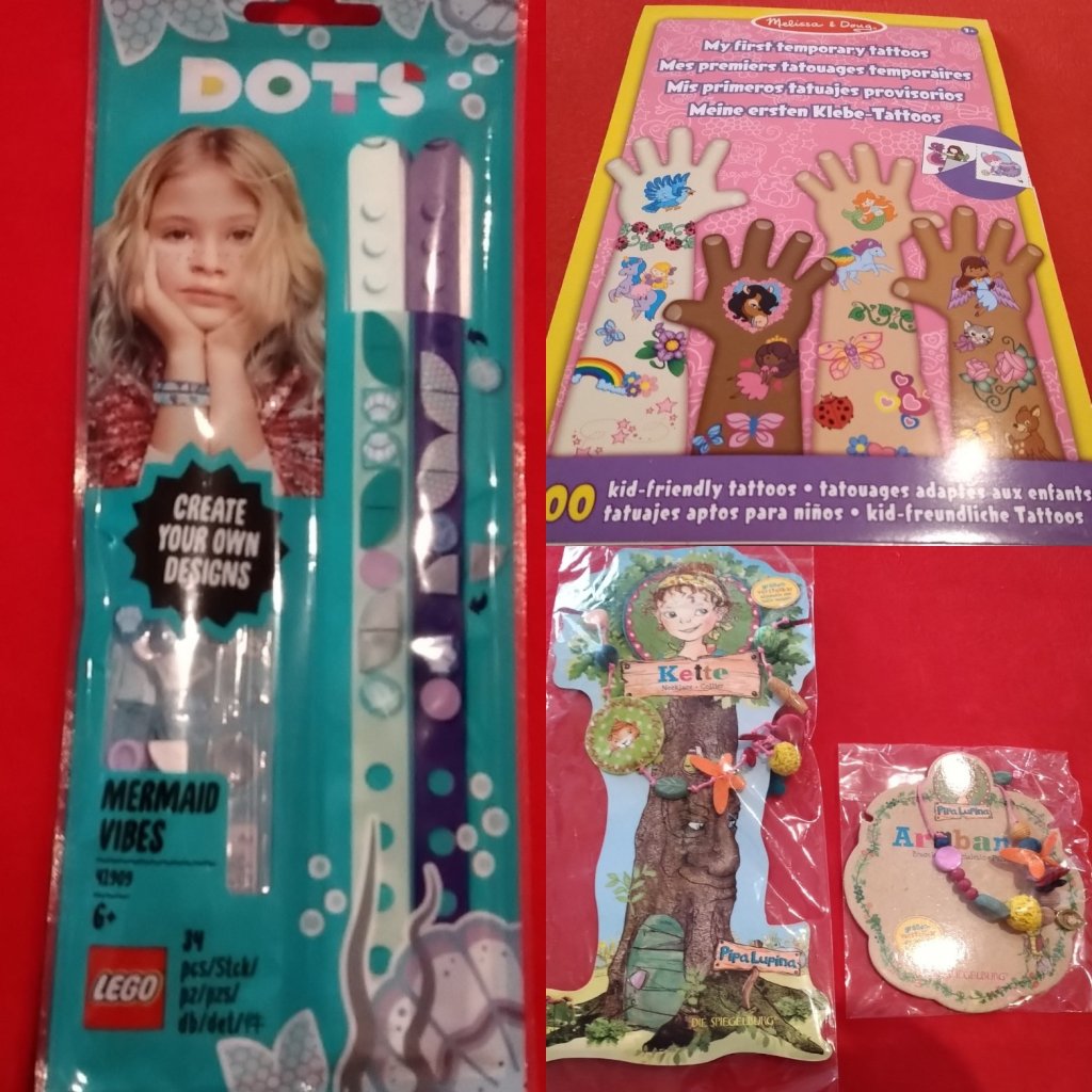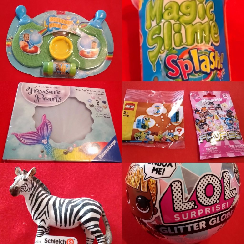 In dieser Kategorie könnt ihr tatsächlich viel sparen, wenn ihr auf Angebote und Sonderaktionen achtet. Kleinigkeiten, die ihr hier sehen könnt sind Schleim, Schleichtiere, kleine Schatztruhen, kleine Puppen und Figuren, Lego oder Playmobil und alles, was mit Seifenblasen zu tun hat.