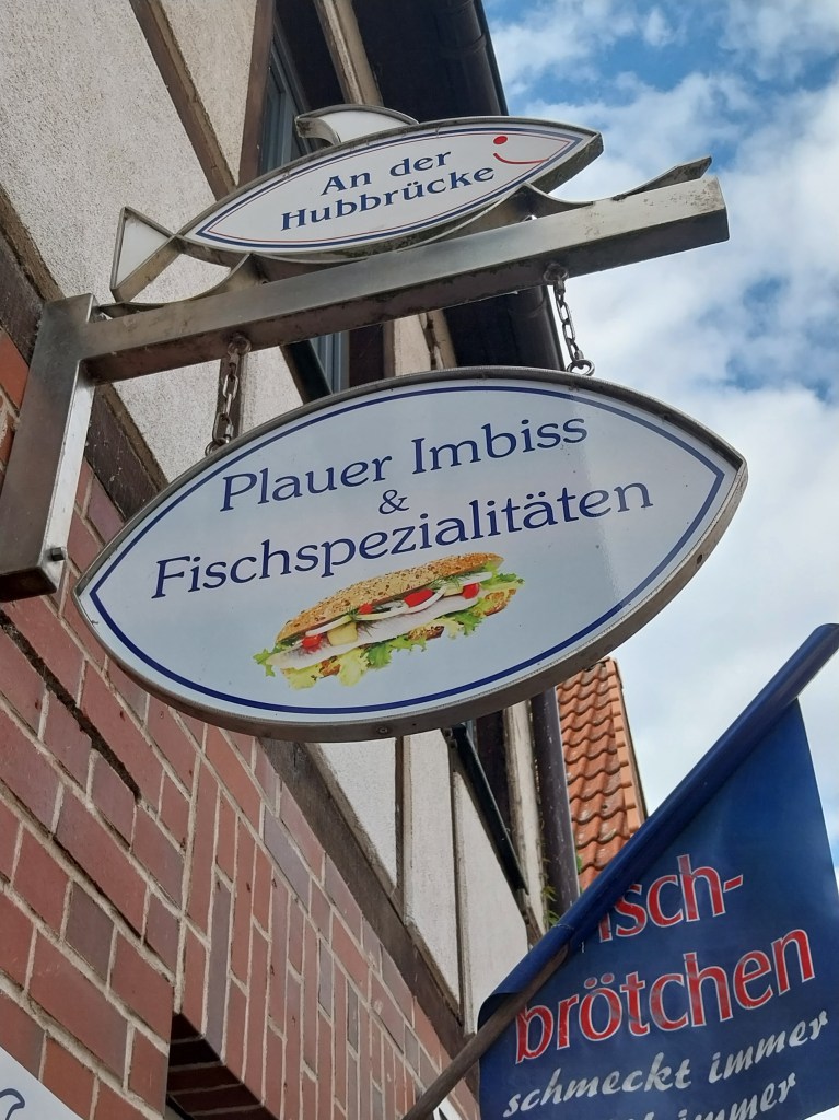Und genau an der Hubbrücke gibt es den absoluten Geheimtipp von mir. Natürlich gibt es in MV sehr viele Geschäfte und Restaurants, die Fischbrötchen verkaufen. Aber wir lieben unsere nicht in Warnemünde am Strand, sondern die besten, die wir kennen, kommen hier aus Plau aus dem Fischimbiss „An der Hubbrücke“. Viola und Holger betreiben hier mit absolutem Herzblut einen Imbiss, der nicht nur individuell einzigartig dekoriert ist, nein, auch frisch und lecker wird alles direkt zubereitet. Mein Mann liebt die Fischbuletten, ich das Fischbrötchen mit Krabbensalat und Algen.
